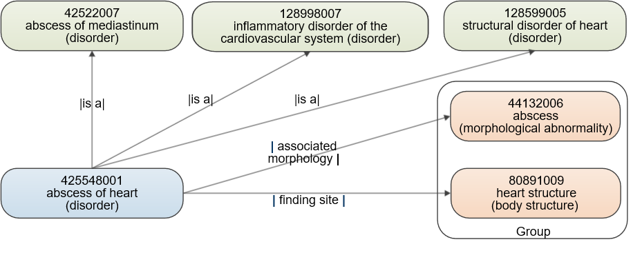 Das folgende Beispiel zeigt die definierenden Relationen des Konzepts |abscess of heart|. Die Attributrelationen |associated morphology| und |finding site| werden verwendet, um das Ausgangskonzept |abscess of heart| den Zielkonzepten |abscess| und |heart structure| zuzuordnen.