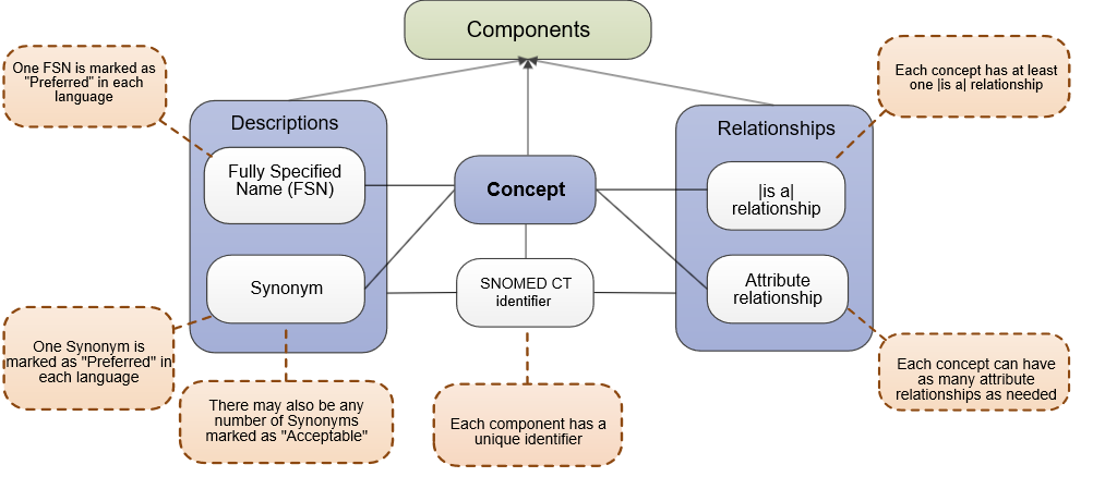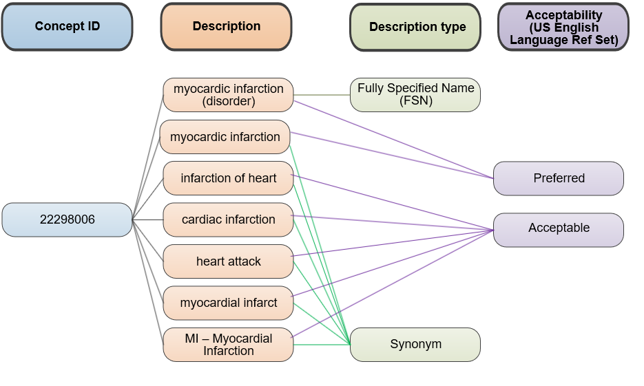 Jedem Konzept ist eine Reihe von Textbeschreibungen zugeordnet. Diese entsprechen der menschenlesbaren Form eines Konzepts. Es werden zwei Arten von Beschreibungen verwendet, um jedes Konzept abzubilden: Fully Specified Name (FSN) und Synonym.