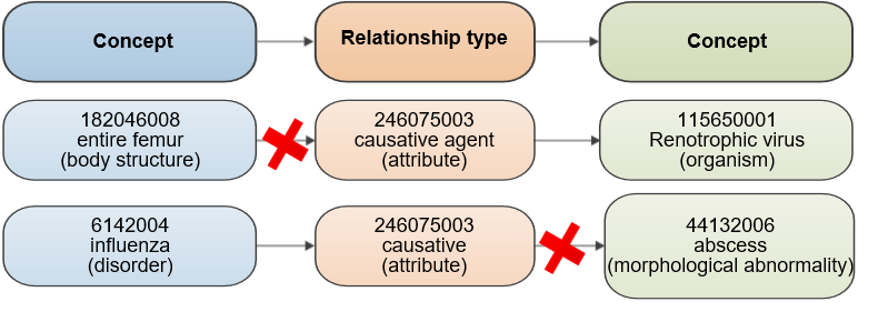 Das erste untenstehende Beispiel verstösst gegen die Beschränkung des Definitionsbereichs |causative agent|, da Nachkommen von |body structure| nicht im Definitionsbereich |causative agent| enthalten sind. Das zweite Beispiel in Abbildung 9 ist in Bezug auf die Beschränkung des Definitionsbereichs |causative agent| korrekt, da |disorder| im Definitionsbereich von |causative agent| enthalten ist. Jedoch verstösst dieses Beispiel gegen die Wertebereichseinschränkung |causative agent|, da Nachkommen des Konzepts "morphologische Anomalie" nicht im Wertebereich des Relationstyps |causative agent| enthalten sind.