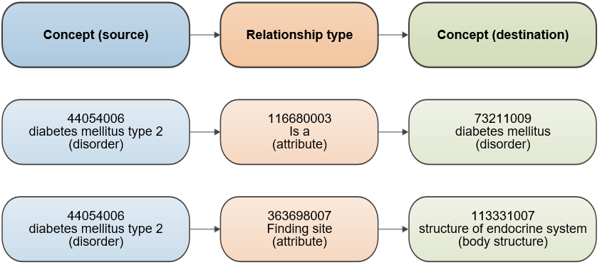 Eine Relation stellt eine sinnhafte Verbindung zwischen zwei Konzepten dar. Relationen werden verwendet, um die Bedeutung eines Konzepts logisch so zu definieren, dass es von einem Computer verarbeitet werden kann. Ein drittes Konzept, ein sogenannter Relationstyp (oder Attribut), wird verwendet, um die Bedeutung der Verbindung zwischen dem Ausgangs- und dem Zielkonzept darzustellen. Innerhalb von SNOMED CT sind verschiedene Arten von Relationen verfügbar.