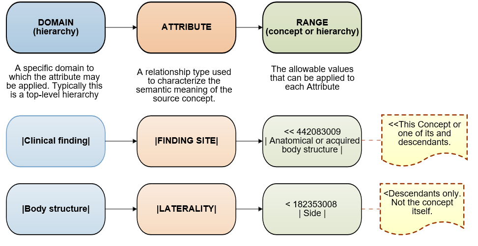 <figure><img src="https://2057870300-files.gitbook.io/~/files/v0/b/gitbook-x-prod.appspot.com/o/spaces%2FRMwWX8s4yIrwfaZjMxiT%2Fuploads%2Fgit-blob-4fd77e9e6ae6b9c80db46cc66479fe71169ee534%2F61154031.png?alt=media" alt=""><figcaption><p><em>Abbildung 10: Beispiele mit angegebenem Definitionsbereich und angegebenem Wertebereich für die Attribute |finding site| und |laterality|</em></p></figcaption></figure>