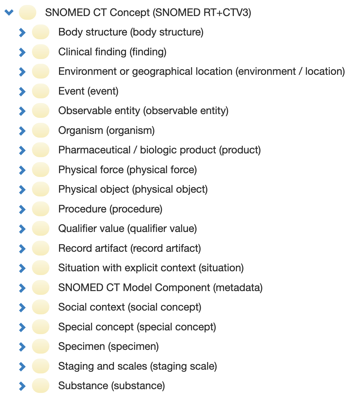<figure><img src="https://2317125167-files.gitbook.io/~/files/v0/b/gitbook-x-prod.appspot.com/o/spaces%2FRqD57MbRYSFSsKbOrkOa%2Fuploads%2Fgit-blob-03f52df42ab88025373357abaa3a2d7158a87f23%2F142134432.png?alt=media" alt=""><figcaption><p><strong>Figure 6</strong> – The 19 SNOMED CT top level hierarchies as displayed in the SNOMED International browser () taxonomy view</p></figcaption></figure>
