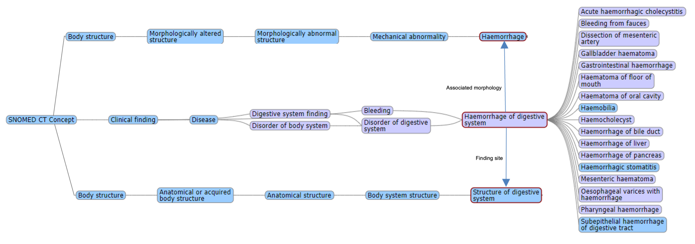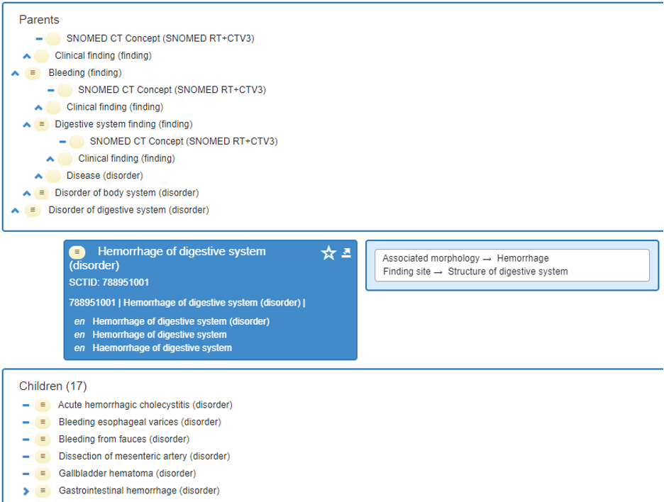 <figure><img src="https://2317125167-files.gitbook.io/~/files/v0/b/gitbook-x-prod.appspot.com/o/spaces%2FRqD57MbRYSFSsKbOrkOa%2Fuploads%2Fgit-blob-d2be6b9ff2977273865cc5080e159c93879943f7%2F142134429.png?alt=media" alt=""><figcaption><p><strong>Figure 9</strong> – Full polyhierarchical view of concept 788951001 |Hemorrhage of digestive system (disorder)| (International Edition 2021-07-31) using Ontoserver Shrimp browser ()</p></figcaption></figure>