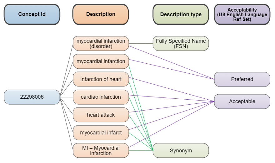 A *synonym* is “a word or phrase that expresses the meaning of a SNOMED CT concept in a specific language” (SNOMED International 2020). Each concept may have multiple synonyms, one of which is marked as “preferred” to support consistent recording of the underlying concept. The Preferred Term (PT) is “the term deemed to be the most clinically appropriate way of expressing a concept in the specified language context” (SNOMED International 2020). It is the recommended description to display a concept. The PT should be unique within its own hierarchy and should not contain homonyms. The other synonyms are marked as ‘Acceptable’. Synonyms are useful for retrieval purposes.