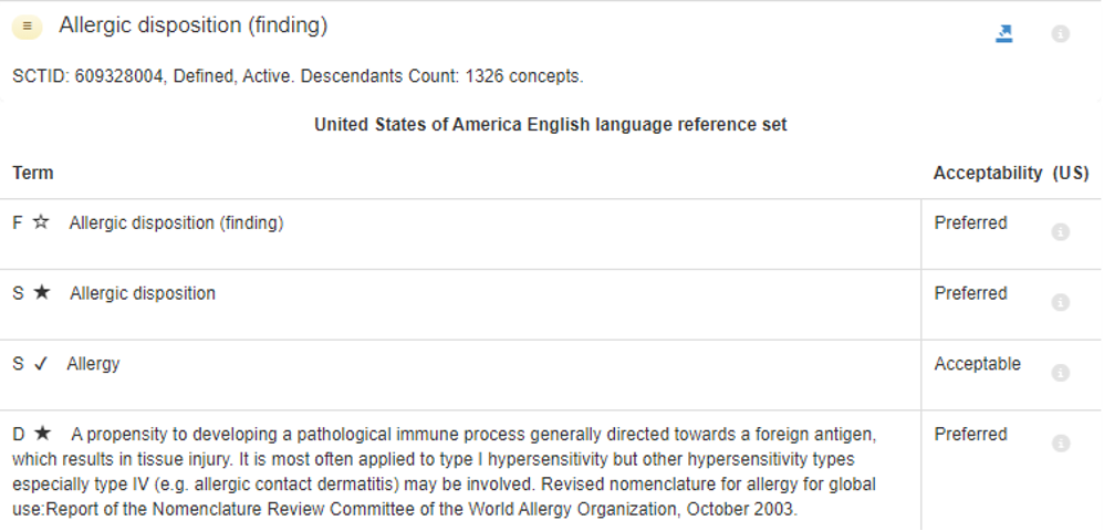 <figure><img src="https://2317125167-files.gitbook.io/~/files/v0/b/gitbook-x-prod.appspot.com/o/spaces%2FRqD57MbRYSFSsKbOrkOa%2Fuploads%2Fgit-blob-dce1de4f312edc8f8a48003f27ac0ddb1b4922be%2F142134433.png?alt=media" alt=""><figcaption><p><strong>Figure 5</strong> – Illustration of the three SNOMED CT Description types in the US English language refset of concept 609328004 |Allergic disposition (finding)| (International Edition 2021-07-31) F - Fully Specified Name; S - Synonym; D - Definition</p></figcaption></figure>